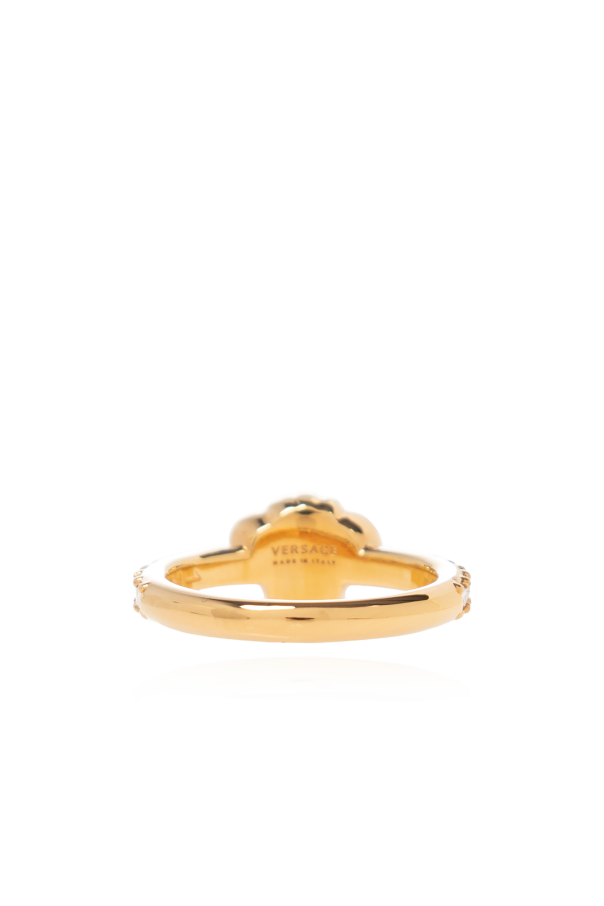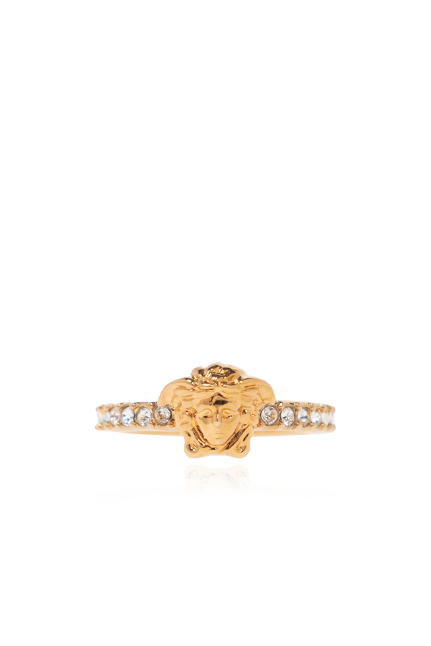 Gold-tone ring from Versace. Made in metal, this item showcases the brand\'s signature Medusa face and glossy Swarovski crystals.