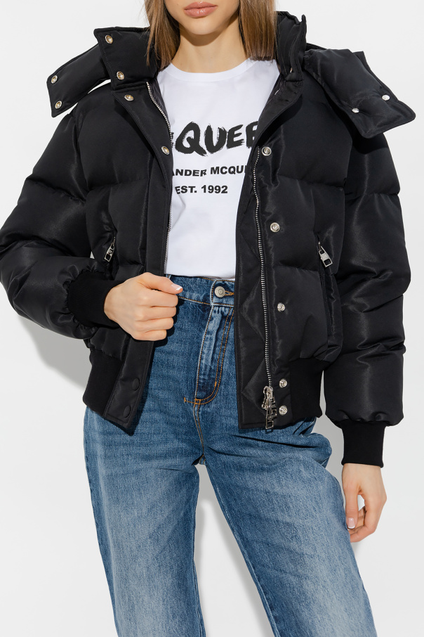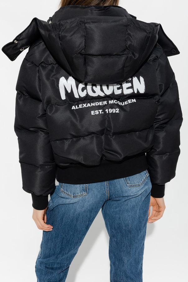 Black insulated quilted jacket from Alexander McQueen. Fastened with snaps and a two-way zip, this garment features a detachable hood, white logo at the back, two zip pockets and ribbed trims at the hem and cuffs.
