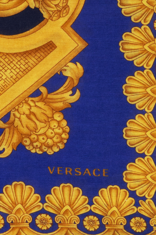 Navy blue and yellow scarf from Versace. Crafted from a blend of modal, cotton and cashmere, this item showcases the brand's signature pattern.