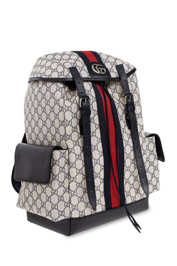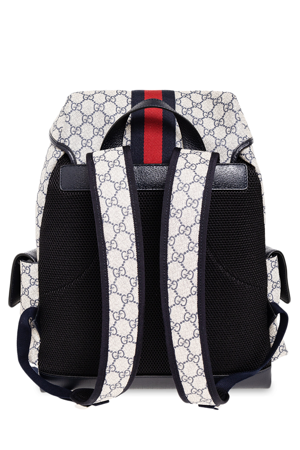 Beige and navy blue ‘Ophidia Medium’ backpack from Gucci. Crafted from GG Supreme canvas and trimmed with calf leather, this design cinches closed with drawstrings and features snap closures, logo application, the brand\'s signature navy blue and red Web stripe detailing, side flapped pockets with magnetic closures, a half-round handle, adjustable shoulder straps, silver-tone metal hardware and one internal compartment with a velcro pocket.