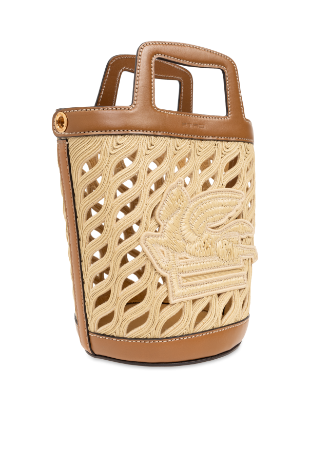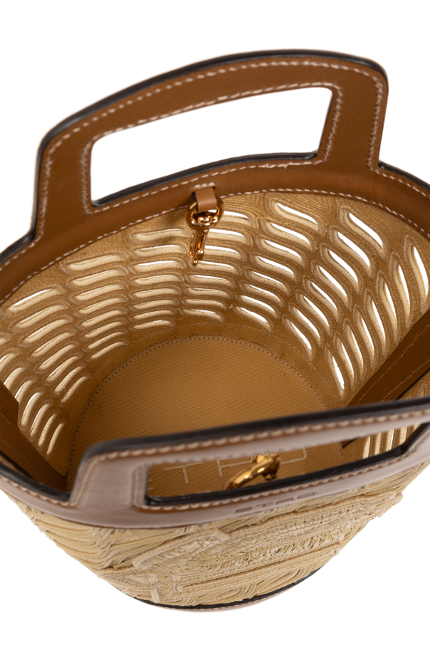 Introducing the ‘Coffa’ Shopper Bag by Etro, a masterpiece of craftsmanship that harmoniously blends functionality with high fashion. This exquisite piece is distinguished by its bucket-like shape, featuring a broad base that gracefully tapers towards the top, ensuring both elegance and practicality in its design. The bag is meticulously crafted from a canvas that mimics a sophisticated weave, presenting a light brown hue juxtaposed with darker brown elements such as the base, trim, and handles, achieving a striking contrast. The material composition includes premium leather and polyester, ensuring durability while maintaining a lightweight feel. A decorative, embossed pattern adorns the front, serving as a hallmark of the designer’s ingenuity. Functionality is paramount, with two integrated short handles for hand carrying and an optional, adjustable shoulder strap adorned with a colorful, striped pattern and leather accents, mirroring the bag’s color scheme. The interior reveals a sleek, brown surface possibly equipped with a closure or pocket for organization, alongside a spacious main compartment that is easily accessible, thanks to the wide opening. Why Purchase This Product? Exclusive Design: Stand out with the unique, woven texture and contrasting colors. Versatile Carrying Options: Equipped with both short handles and a detachable shoulder strap for varied styling. Signature Details: The embossed front pattern and premium materials signal a distinguished taste. Practical Elegance: Spacious yet structured, this bag merges the everyday functionality with the luxury of design.