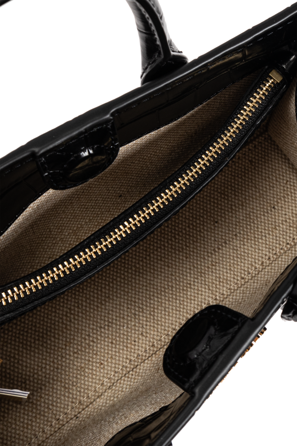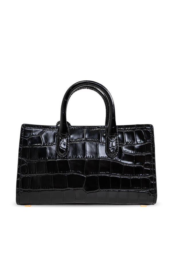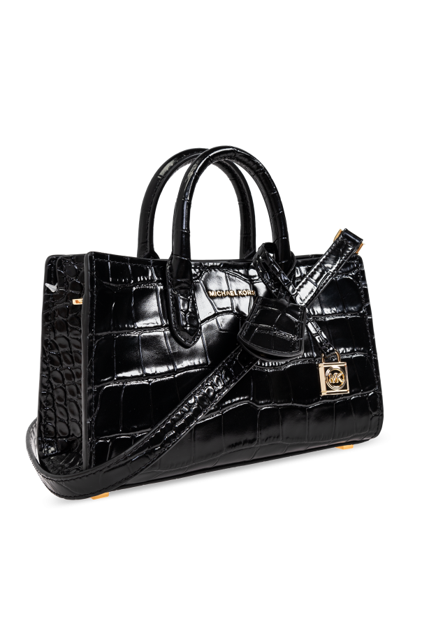 Introducing the exclusive Scarlett Shoulder Bag from the renowned designer, Michael Michael Kors. This exquisite piece epitomizes sophistication and luxury, making it the quintessential accessory for the modern, stylish woman. Crafted from premium black cowhide leather with a crocodile-embossed texture, the Scarlett bag boasts a classic rectangular silhouette. It features two handles for hand-carrying and a detachable shoulder strap, offering versatile carrying options to suit any occasion. The interior of the bag is lined with a light-colored fabric, secured by a golden zipper, ensuring both elegance and functionality. The medium size of the bag makes it practical for daily use while retaining an air of refinement for special events. Adorned with the iconic gold \"MICHAEL KORS\" logo on the front and a golden \"MK\" charm, this bag exudes an additional touch of brilliance and elegance. Gold accents, including zippers and protective feet at the base, enhance its exclusive appeal. Why Choose This Product? Versatile design with both handles and a detachable shoulder strap Luxurious crocodile-embossed black leather Elegant gold detailing and secure golden zipper Practical medium size with two compartments and a zippered pocket Renowned Michael Michael Kors craftsmanship