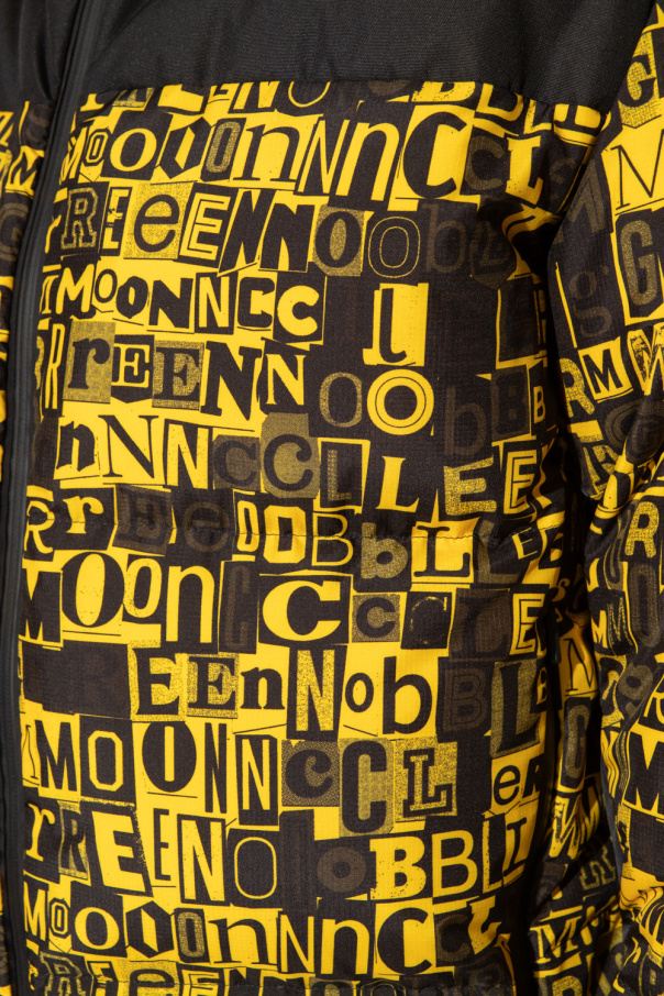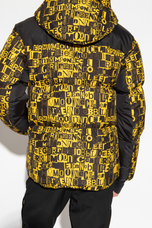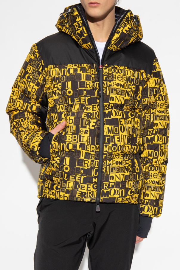Black and yellow ‘Mazod’ down ski jacket from Moncler Grenoble, the ‘Moncler Grenoble Performance & Style’ collection. Embellished with a graphic print, this style features a two-way zip fastening, a logo patch, a drawcord-adjustable hood, two front zip pockets and long sleeves with elasticated cuffs – one has a zipped ski pass pocket.