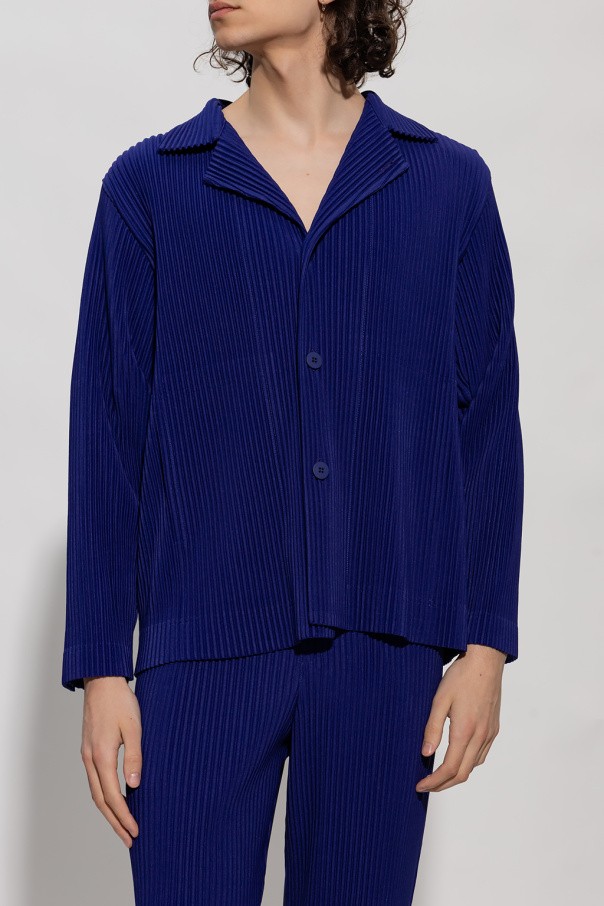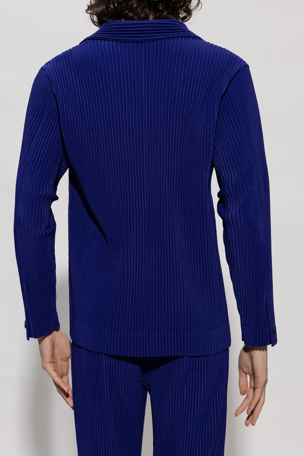 Dark blue blazer from Issey Miyake Homme Plisse. Distinguished by the brand\'s signature pleats, this style features a collar with notch lapels, button fastenings and long sleeves with button cuffs.