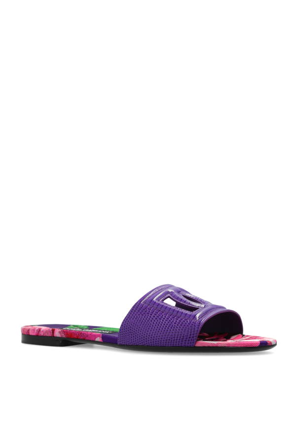 Purple slides from Dolce & Gabbana. Made of leather with a snakeskin effect, this model sits on a black leather sole and showcases an almond-shaped toe and a tactile logo with cutouts on the front.