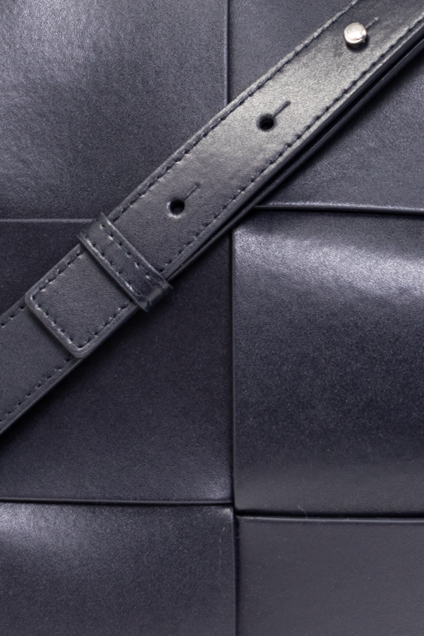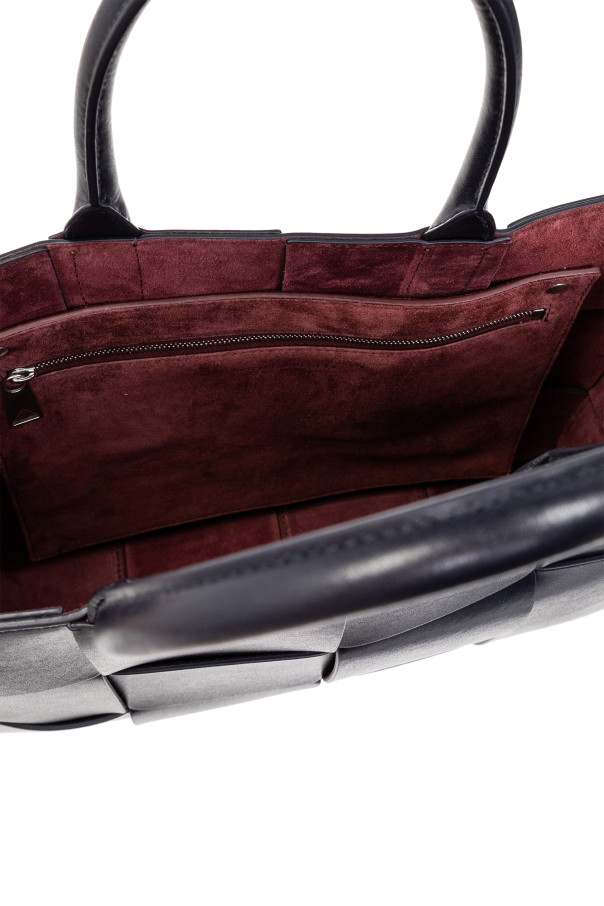 Navy ‘Arco Mini’ shopper bag from Bottega Veneta. Crafted from calf leather the brand’s signature Intreccio weave, this design features two half-round handles, a detachable and adjustable shoulder strap and one internal compartment with maroon suede lining and one zip pocket.
