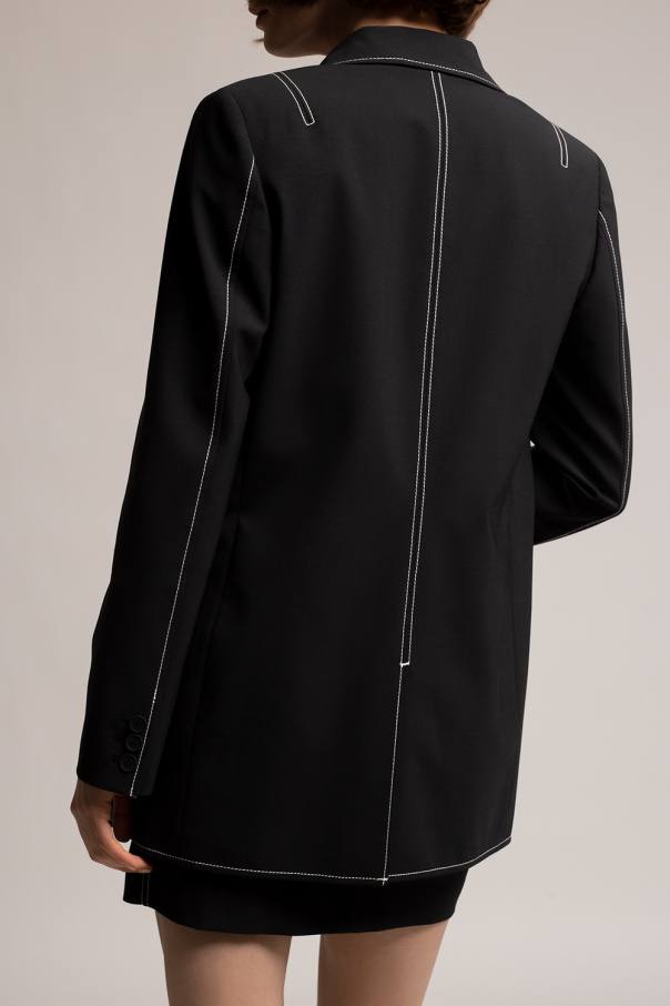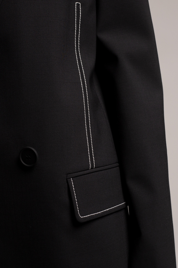 Black ‘Bobbie’ double-breasted blazer from AllSaints. Enriched by contrasting white stitching details, this style features peak lapels, two flapped pockets, one welt pocket, long sleeves with button cuffs and a single vent at the back.