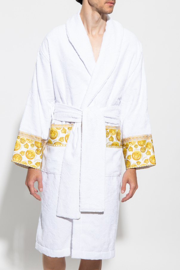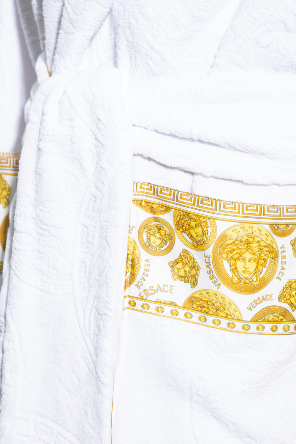 White bathrobe from Versace Home. Made of cotton, this long sleeve design features a jacquard Medusa head and two slip pockets with the iconic Medusa Amplified in yellow and brown.