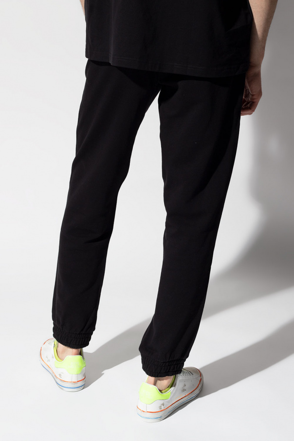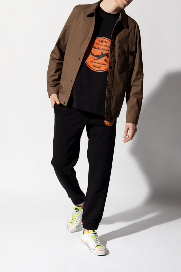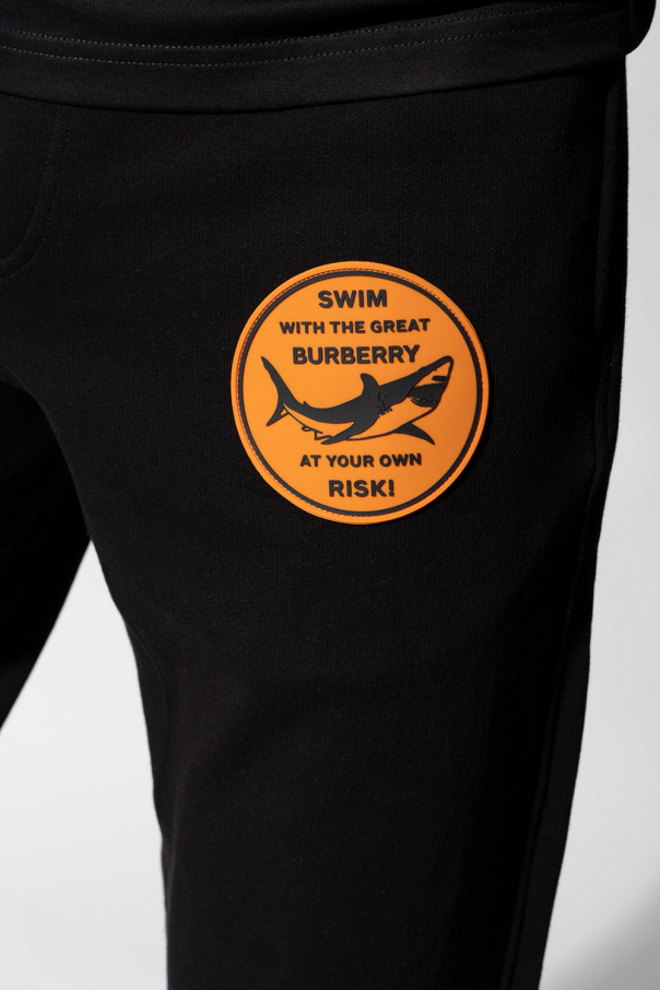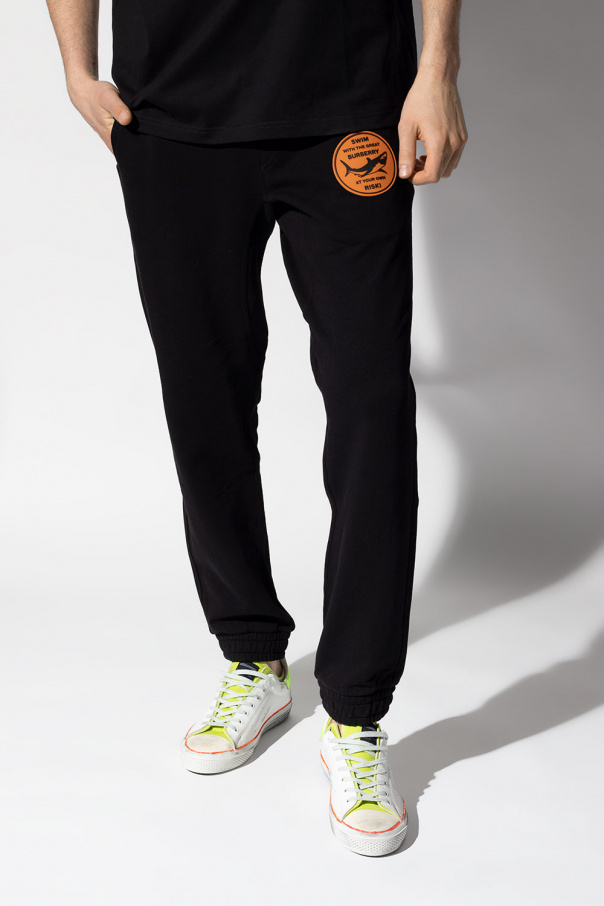 Black sweatpants from Burberry. Emblazoned with an orange and black logo appliqué, this cotton-crafted pair features a drawstring waist, two side seam pockets, one back zip pocket and ribbed cuffs.