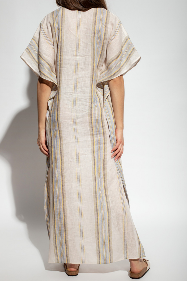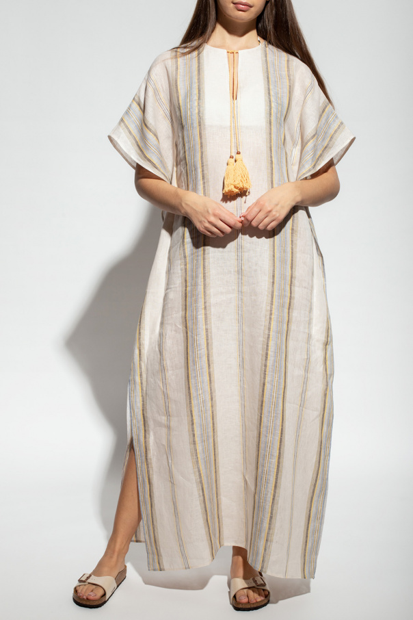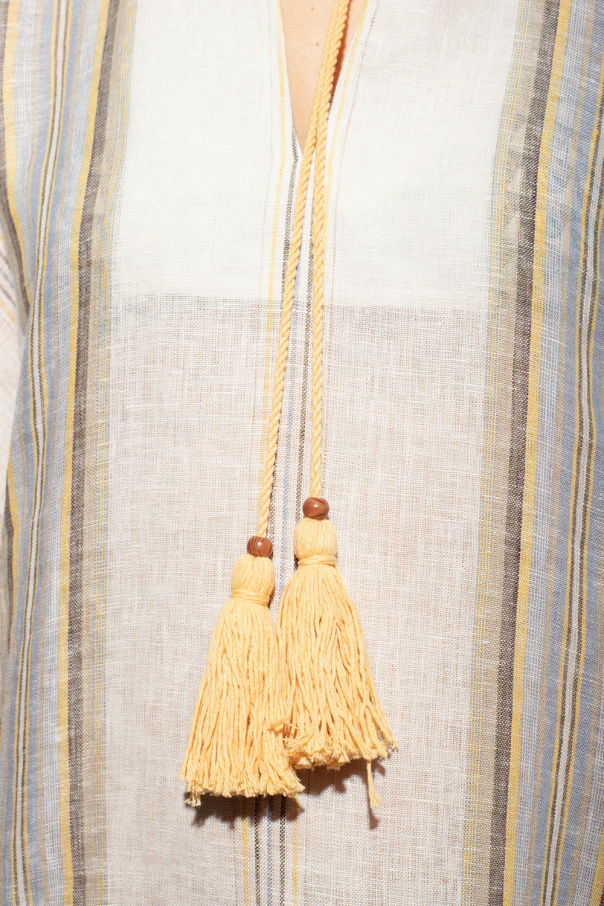 Beige dress from Tory Burch. Made of linen. Decorated with a stripe pattern, this short sleeve design features a round neck with tasselled ties and side slits.