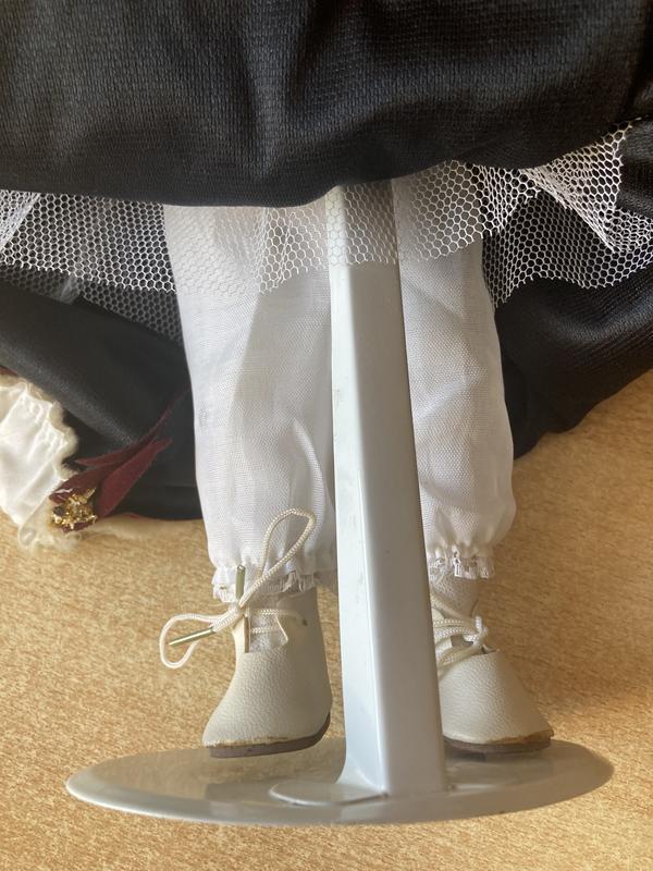 В идеальном состоянии, без дефектов. Купили в начале 90-х годов. Лицо, ручки и ножки- фарфоровые, туловище из ткани. Кукла на подставке-42 см