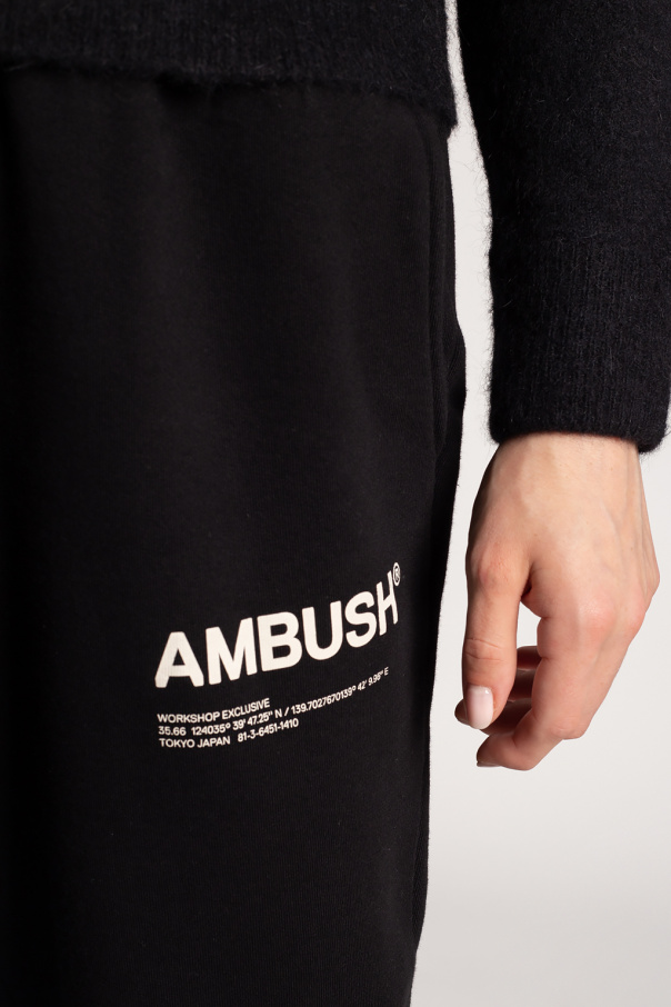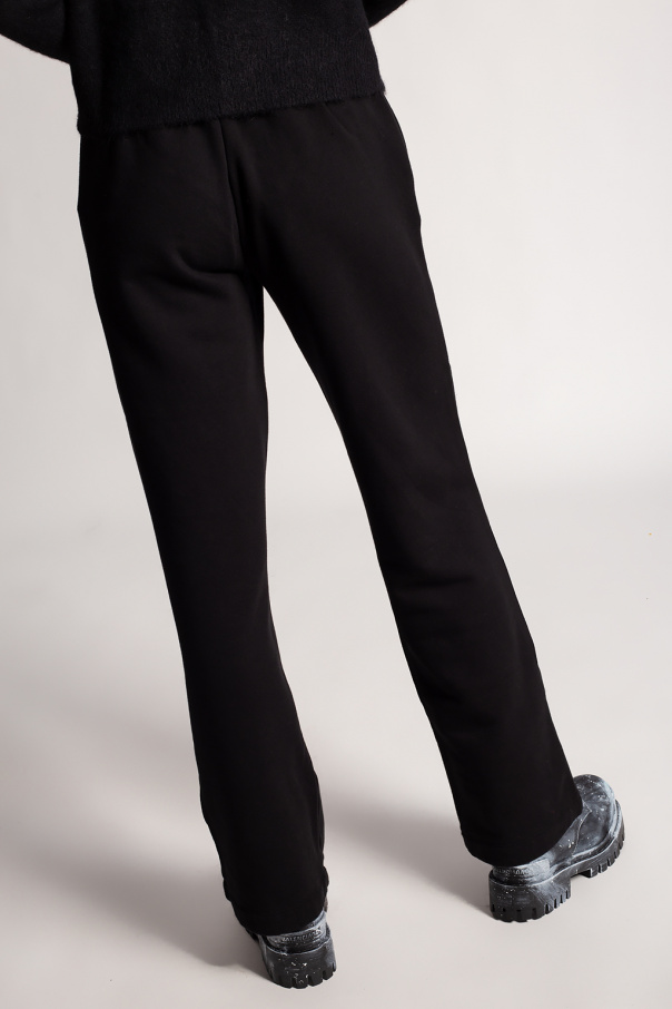 Black sweatpants from Ambush. Made of cotton, this pair falls down with flared legs and features a cream logo print, two front pockets and a drawstring waist.
