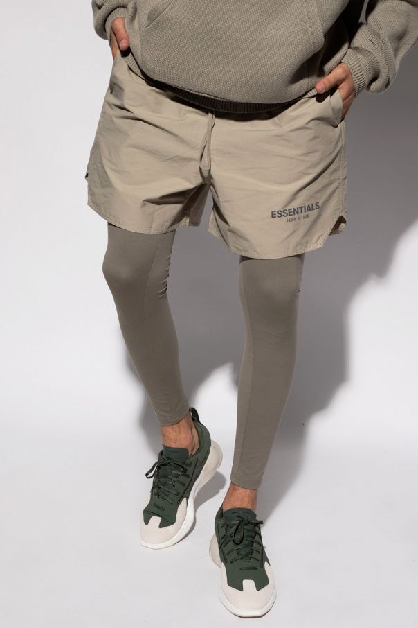 Green and gray shorts from Fear Of God Essentials. Fastened with drawstrings, this pair features a logo patch, reflective logo print, two front pockets, one back pocket and side slits.