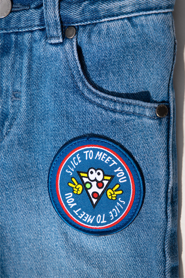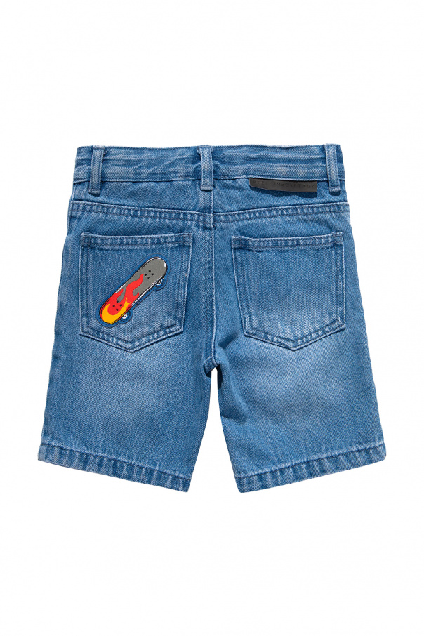 Blue denim shorts from Stella McCartney Kids. Enriched by colourful patches, this pair features a zip fly with a button and classic five pockets.