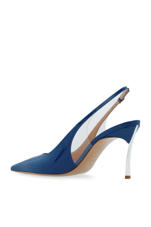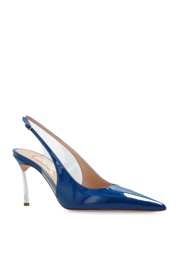 Dark blue ‘Superblade’ pumps from Casadei. Made from glossy leather with a pointed-toe silhouette, this model sits on a beige leather sole and features an adjustable buckle strap on the back, transparent rubber details on the sides and the brand\'s signature high heel made of silver-tone stainless steel.