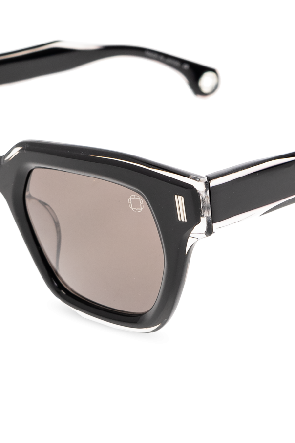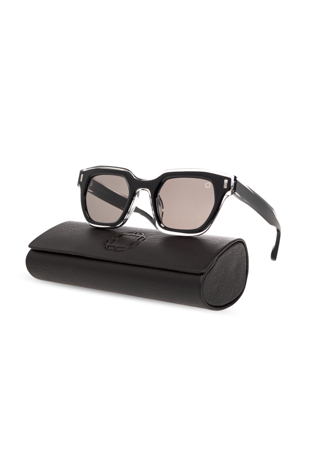 Black ‘Randolph’ sunglasses from Blake Kuwahara. This pair features a square frame, transparent and metal elements, single bridge, integrated nose pads, temples with logo at the tips based on Blake Kuwahara’s Japanese family crest and black gradient lenses with UV protection. Case included. Handmade in Japan.