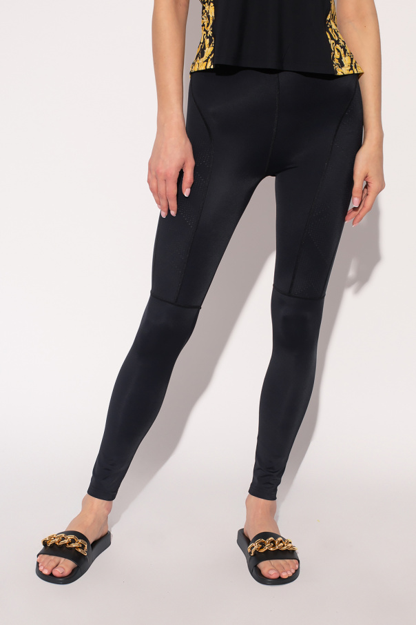 Black training leggings from Versace. This pair is enriched by decorative perforations, embroidered beige Greek pattern and Medusa head.