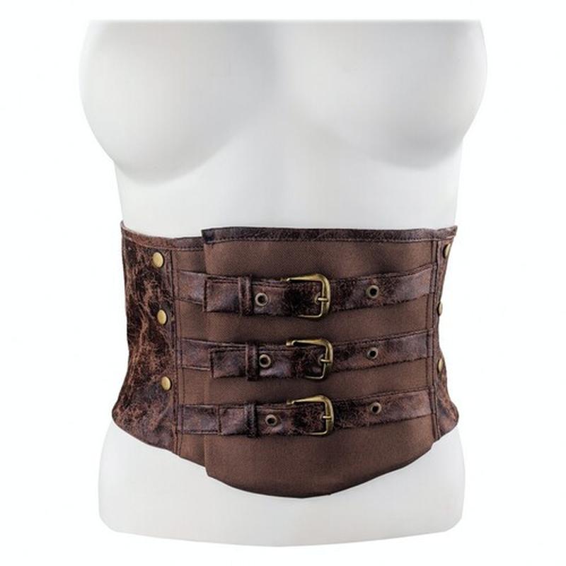 Коричневый пояс-корсет, декорированный искусственной кожей и металлической