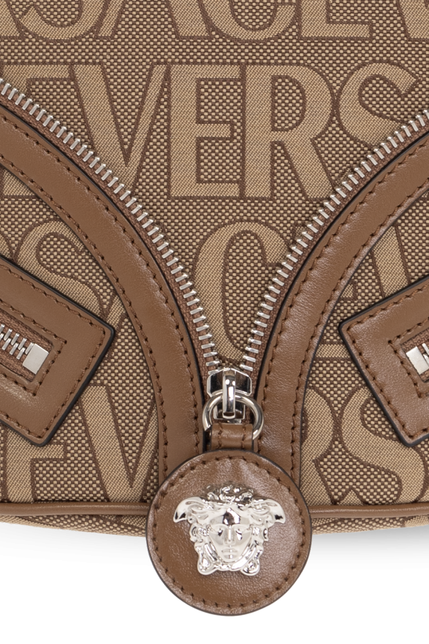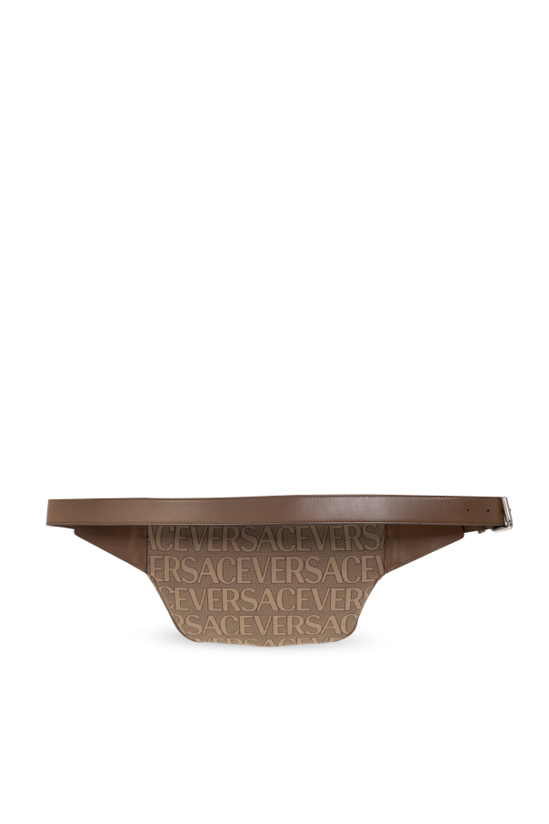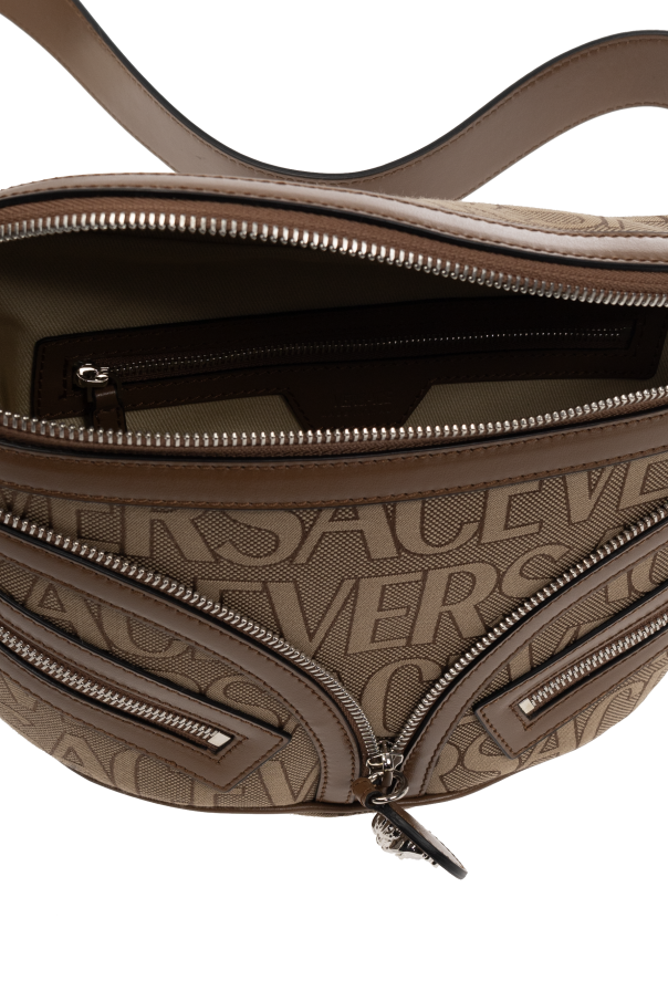 Beige and brown ‘Repeat’ belt bag from Versace. Crafted from fabric with leather trims, this model fastens with a zip and is decorated with a jacquard logo pattern. It is complete with a zip with the iconic Medusa head charm, two zip pockets, adjustable belt, silver-tone metal hardware and one internal compartment with one zip pocket.