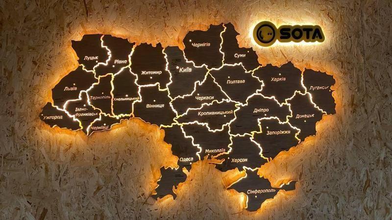 Деревянная карта Украины с LED подсветкой по контуру и подсветкой названий областных центров 200х140 см - отличное решение декоративной подсветки квартиры,