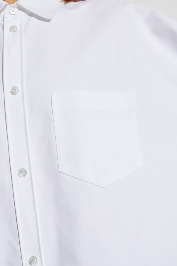 Introducing a quintessential piece from Balenciaga\'s exclusive clothing collection—the Oversize Cotton Shirt in pristine white. This garment redefines the boundaries of modern sophistication and comfort, crafted meticulously from 100% pure cotton. Its oversize silhouette ensures a relaxed fit, while the classic collar and button-down front epitomize timeless elegance. The shirt\'s design features a distinctive longer back hem, adding an element of contemporary flair to its overall appearance. Notably, it boasts a total of four pockets— one elegantly placed at the chest level with rounded corners and visible stitching that adds a touch of artisanal craftsmanship, and three additional pockets along the sides, providing both functionality and style. Without any visible logos or branding, this piece stands out through its impeccable design and quality alone, making it a versatile addition to any wardrobe. Whether dressed up with tailored trousers or dressed down with casual denim, this Balenciaga shirt remains an emblem of chic minimalism. Why Purchase This Product? Exclusive Design: A signature piece from Balenciaga, showcasing the brand\'s commitment to high fashion and quality. Versatile Elegance: The shirt\'s oversize cut and pure white color make it a timeless garment suitable for various occasions. Functional Detailing: Equipped with four pockets, this shirt combines practicality with modern style. Premium Material: Made entirely of cotton, it promises breathability and comfort, ideal for all-day wear.