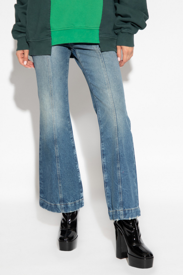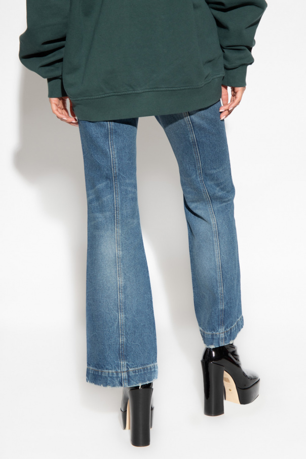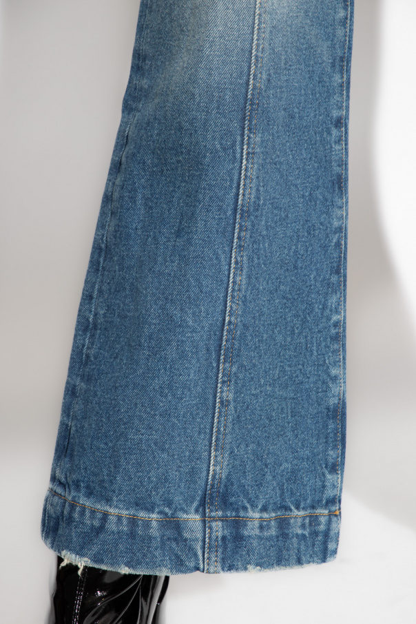 Blue jeans from Ambush. Falling with flared legs, this pair features a distressed effect, a zip fly with a button, three slip pockets and a white patch with an embossed logo at the back.