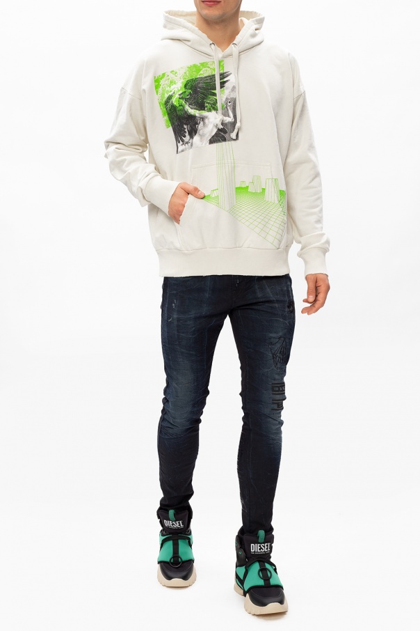 Black, green and cream ‘S-Sharquez’ sneakers from Diesel. Showcasing detachable gaiter-like detail with metal ring and white logo print, this lace-up pair features high-top silhouette set on a cream chunky rubber sole.