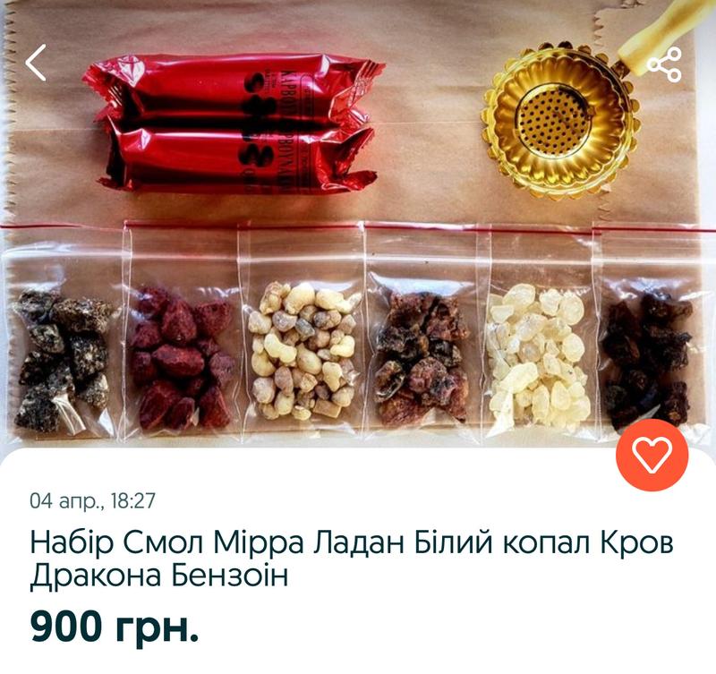 Смолы- Ладан, Мирра, кровь Дракона, Белый Копал, Бензоин, Ель.
