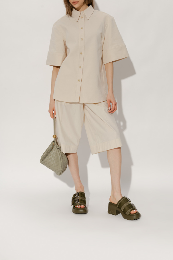 Green ‘Flash’ mules from Bottega Veneta. Crafted from leather and technical material, this model sits on a robust sole in green rubber and features velcro closures with decorative buckles.
