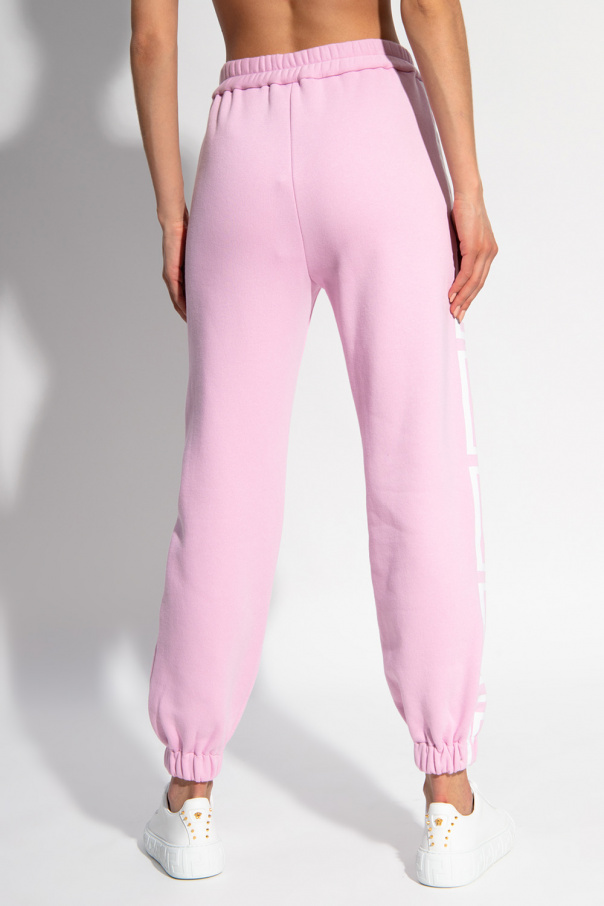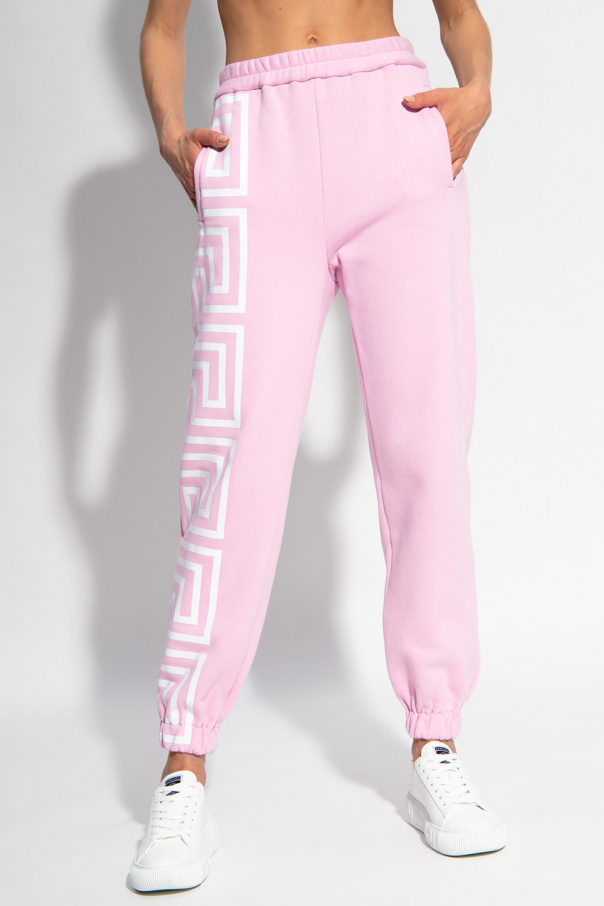 Pink sweatpants from Versace. Crafted from cotton, this pair showcases an embroidered Greek pattern it white. It is complete with a drawstring waist, two side seam pockets and elasticated cuffs.