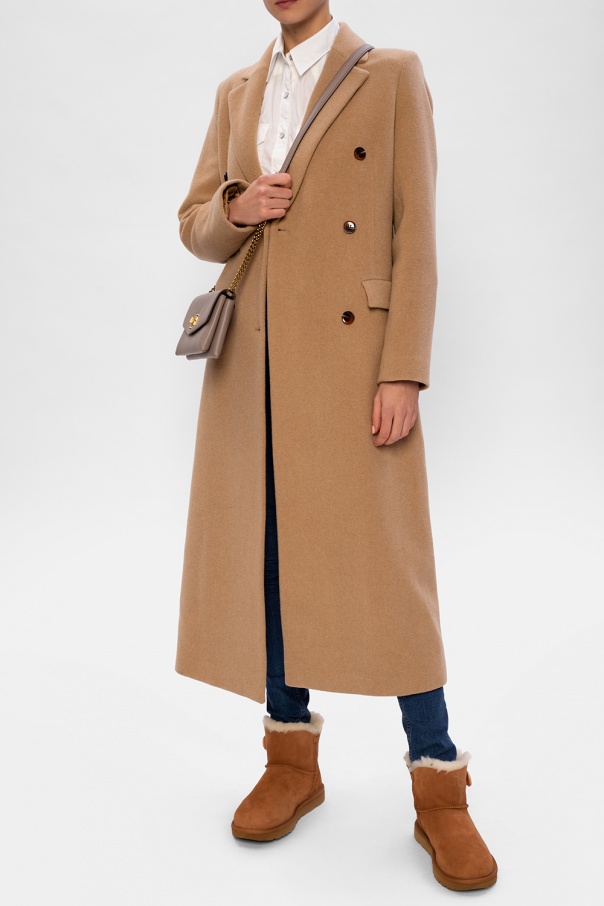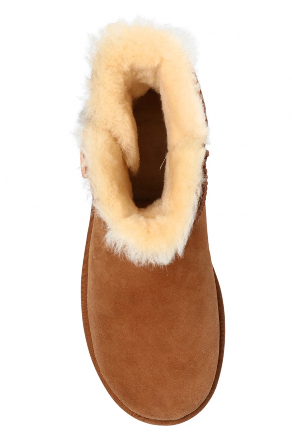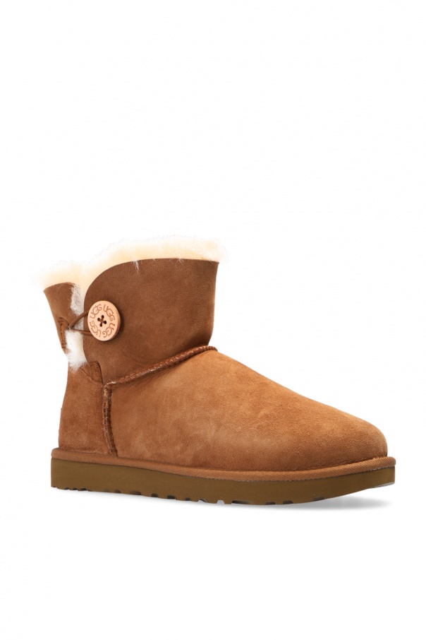 Brown 'Mini Bailey Bow II' snow boots from UGG. Padded with cream wool, this suede-crafted pair sits on a dark brown tread sole in EVA foam. Side button fastening, a logo patch at the heel and distinctive stitching details complete the look.