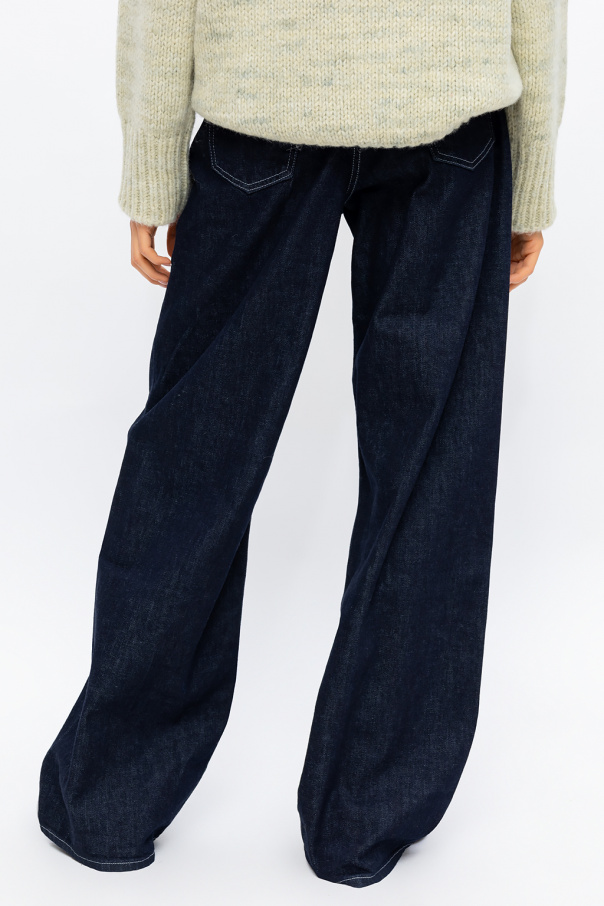 Navy wide leg jeans from BITE STUDIOS. Made of Italian organic cotton from sustainable production, this high-waisted design is complete with a zip and button closure, B embroidery, white recycled logo patch and four slip pockets.