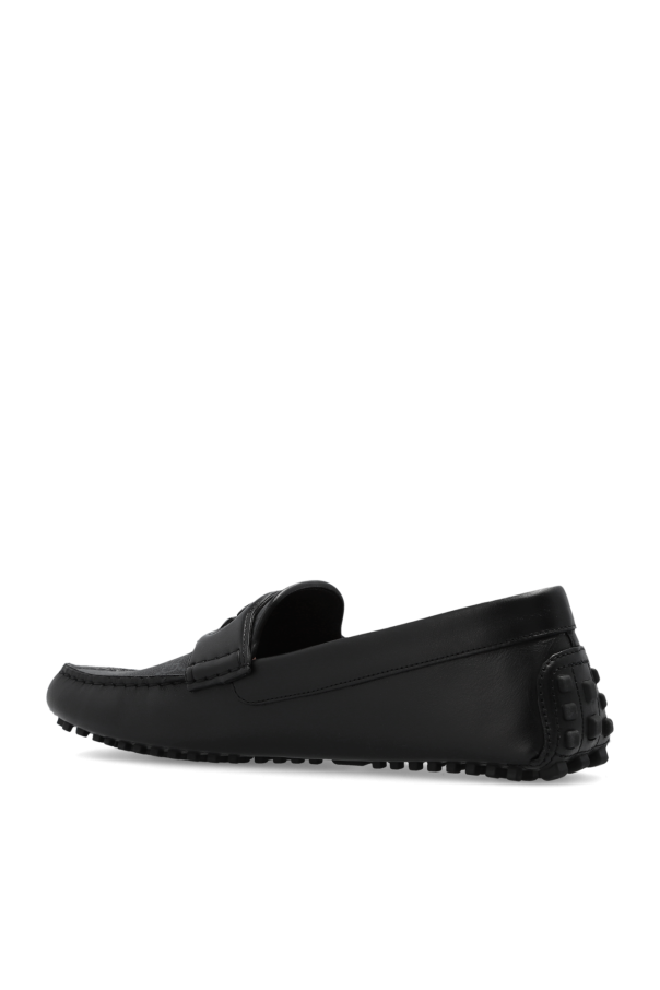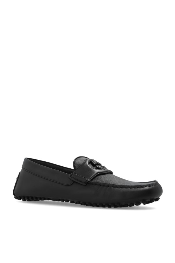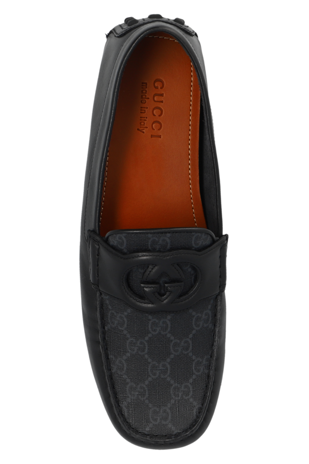 Black moccasins from Gucci. Crafted from leather and ‘GG Supreme’ canvas, this model sits on a black leather sole with a rubber trim and features a monogrammed strap on the vamp.