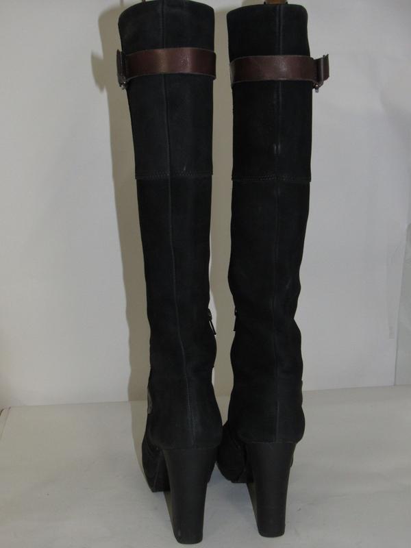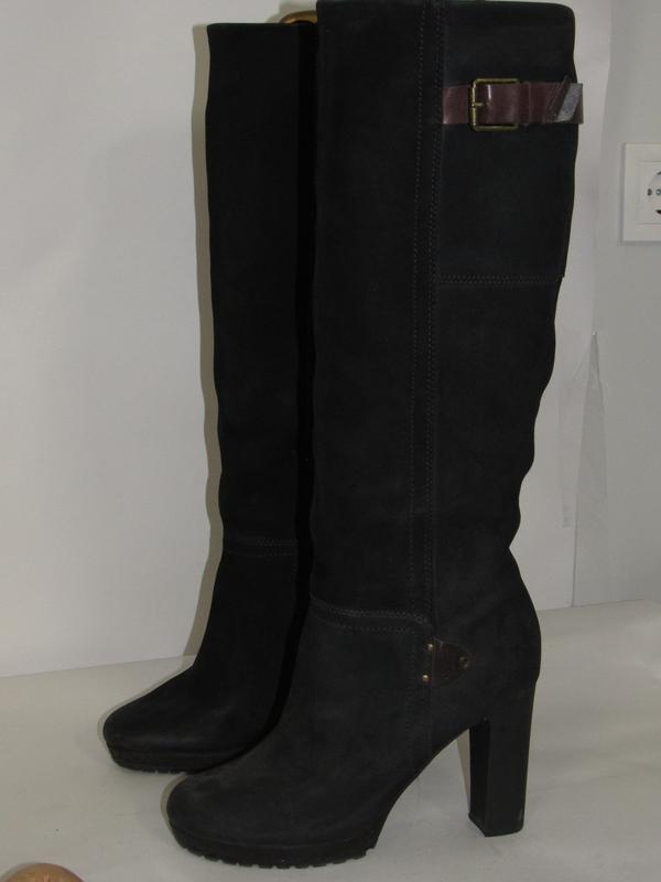 Шикарні якісні високі чобітки-труби, всередині злегка утеплені, широкий стійкий каблук-10см, виконані із якісної нубукової шкіри, на одному збоку по обідку мають потертості шкіри-див. фото, так у хорошому стані, гарно тримають форму, стильно дорого дивляться-якість висока, з внутрішньої сторони є замок, ст. 49, обхват голені 35