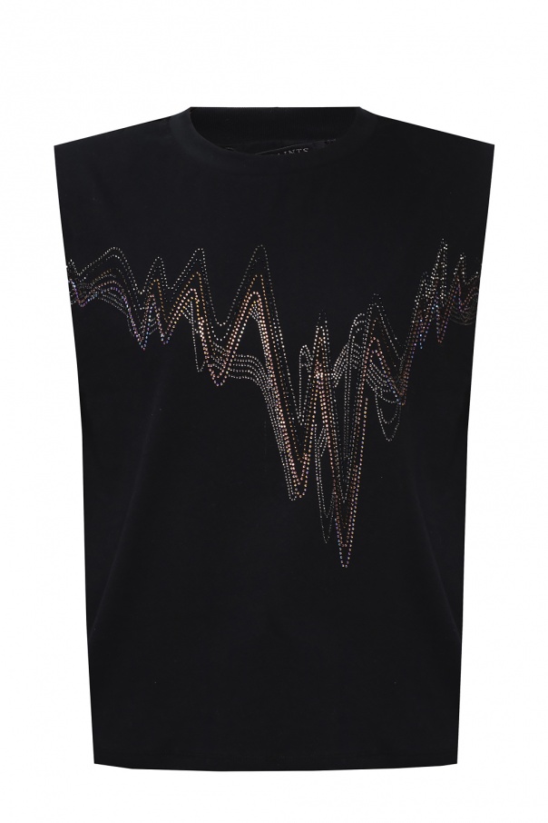 Black ‘Techno’ sleeveless T-shirt from AllSaints. Crafted from cotton, this design features decorative elements in black and pink, padded shoulders and a round neck.