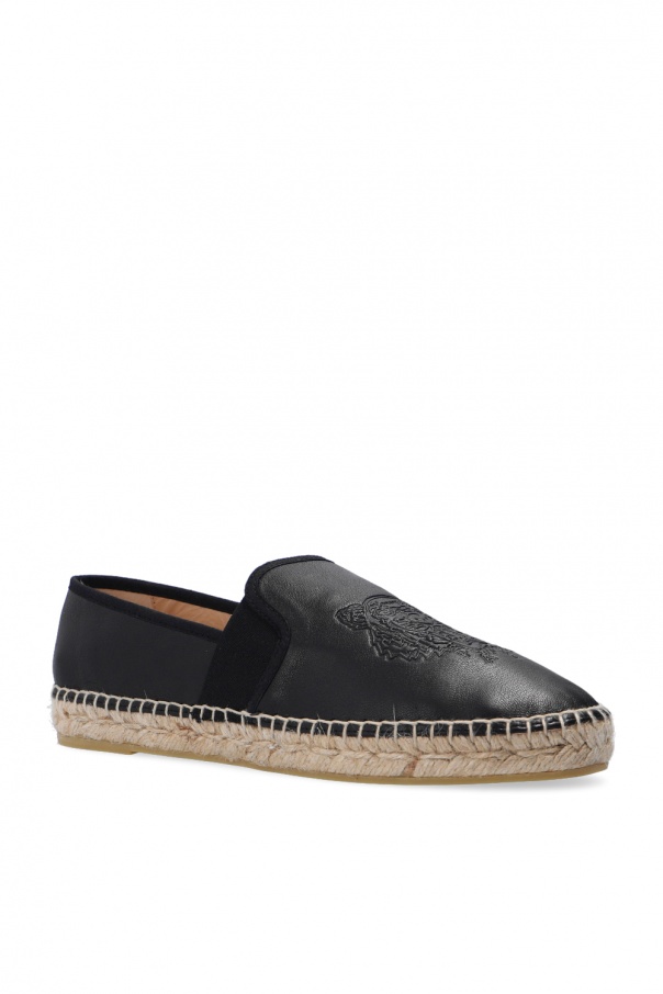 Black espadrilles from Kenzo. Crafted from leather, this pair features an embossed logo and beige rubber sole.