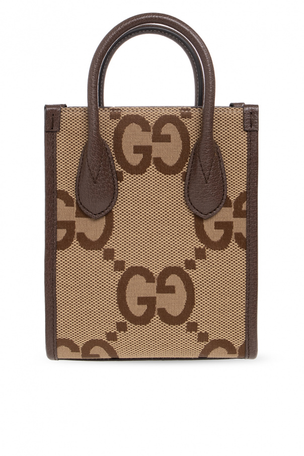 Beige and brown shoulder bag from Gucci. Crafted from the brand's signature monogrammed Jumbo GG canvas and trimmed with leather, this design features two rigid handles, a detachable and adjustable shoulder strap with a green and red Web motif, gold-tone metal hardware and one internal compartment with a card slot.