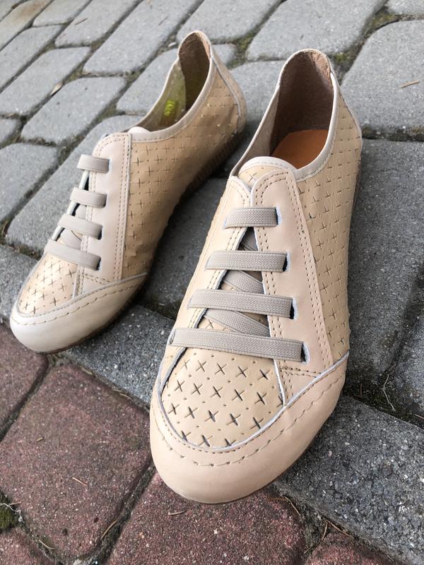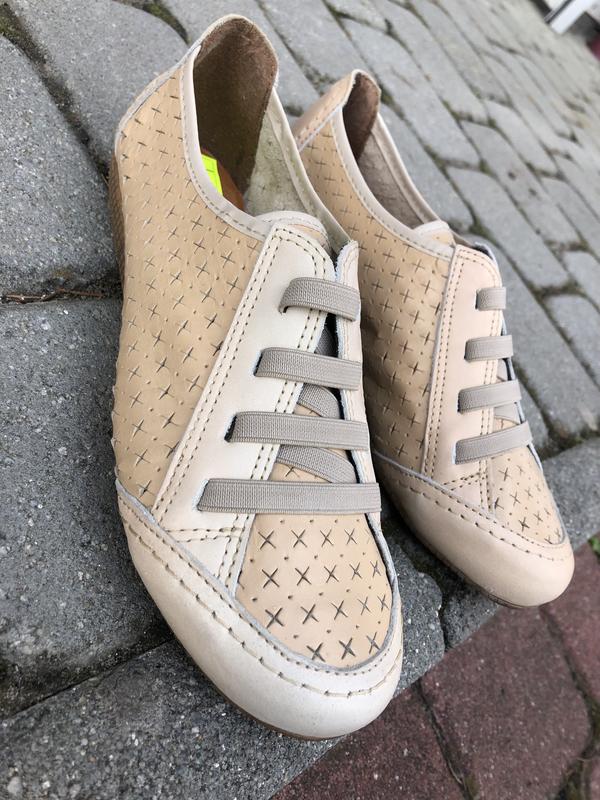 Мокасини шкіряні в дірочку, дихаючі. Виробництво Іспанії . Надзвичайно легкі і комфортні. Замість шнурівки - резинка, що значно полегшує взування. Практична поліуретанова підошва. По стельці 23,5 см