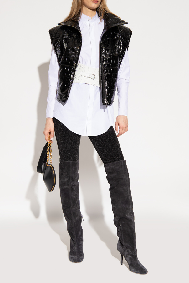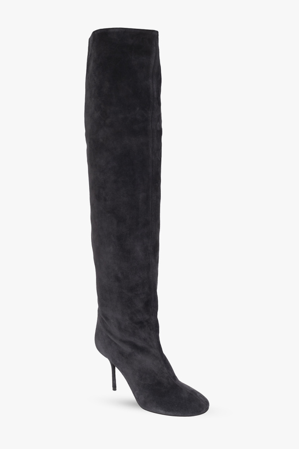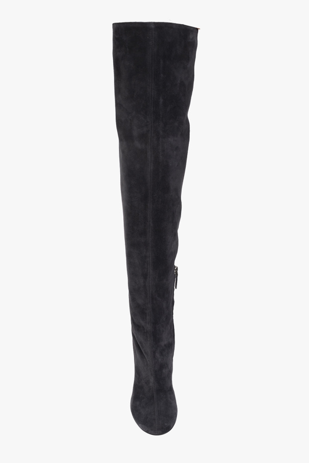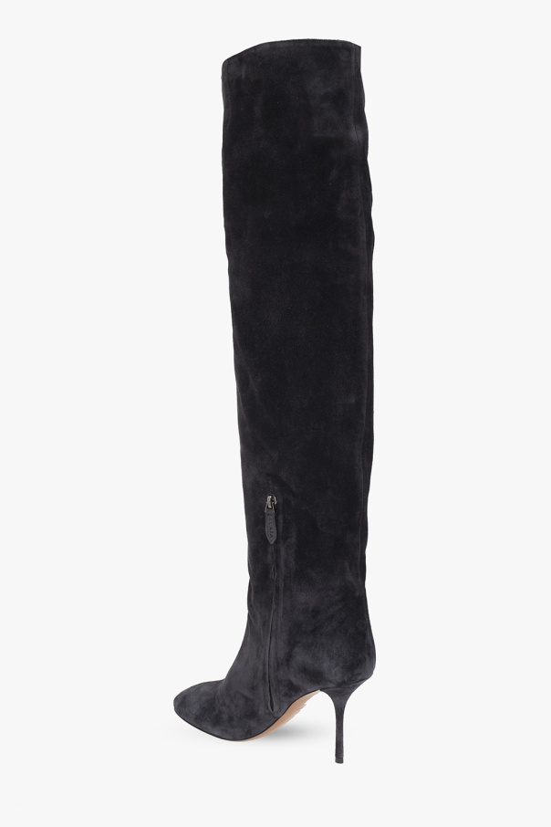 Dark grey ‘Fluide Boot’ heeled boots from Alaia. Made of suede, this pair features a side zip and brown sole constructed from leather and rubber.