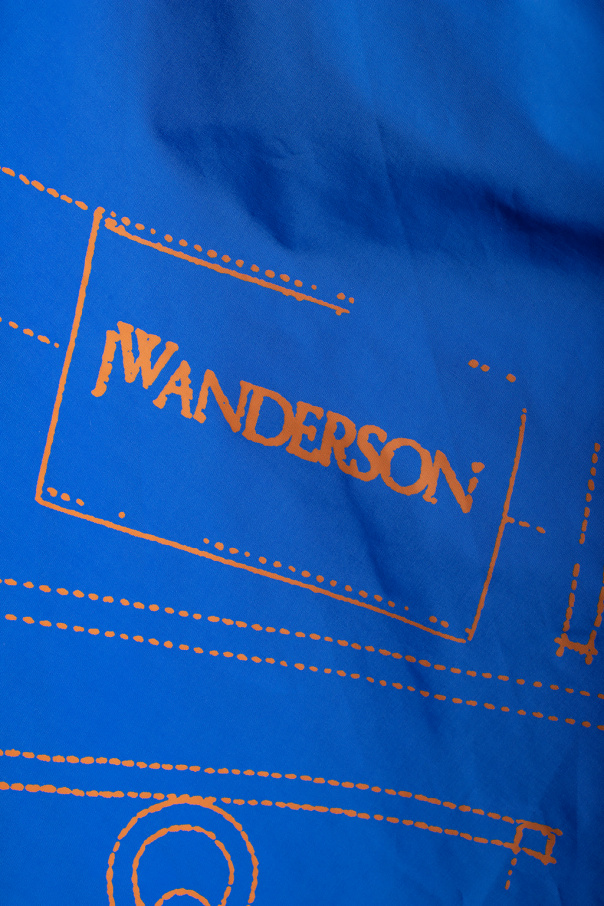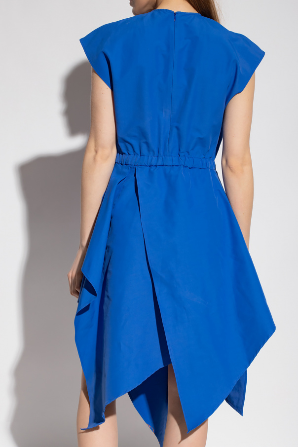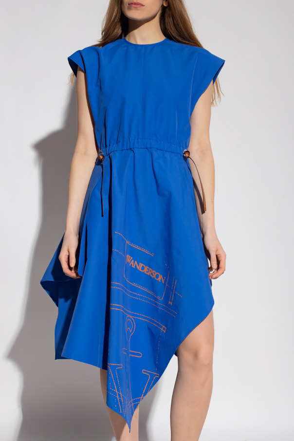 Navy blue dress from JW Anderson. Embellished with a logo pattern, this style features a back zip fastening, a waist-cinching drawstring closure and an asymmetrical trim.