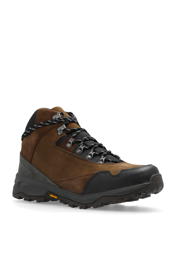 Brown, black and grey boots from Norse Project. Made of leather and fabric, this lace-up pair is decorated with an embossed logo and set on a rubber Vibram sole in brown, black and yellow.