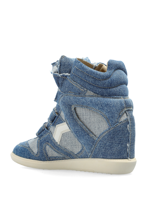 Introducing the exquisite \'Bekett\' wedge sneakers, a masterpiece from the illustrious designer Isabel Marant. These sneakers artfully blend casual elegance and contemporary style, making them a must-have for the discerning fashion aficionado. Crafted from luxurious blue denim, the sneakers exude a chic and effortlessly stylish aesthetic. The high-top design features multiple velcro straps, ensuring an impeccable fit and enhanced support. The hidden wedge discreetly elevates height while maintaining unparalleled comfort. Adorned with a subtle \'V\' pattern on the side, a signature touch from the designer, these sneakers boast a unique charm. The frayed edges of the material contribute to a raw, fashion-forward look, enhanced by a vintage effect that sets them apart. Why choose this product? Exquisite design by renowned designer Isabel Marant Premium construction with denim, leather, and rubber Hidden wedge for added height and elegance Signature \'V\' pattern for a unique touch Perfect blend of comfort, style, and modern trends