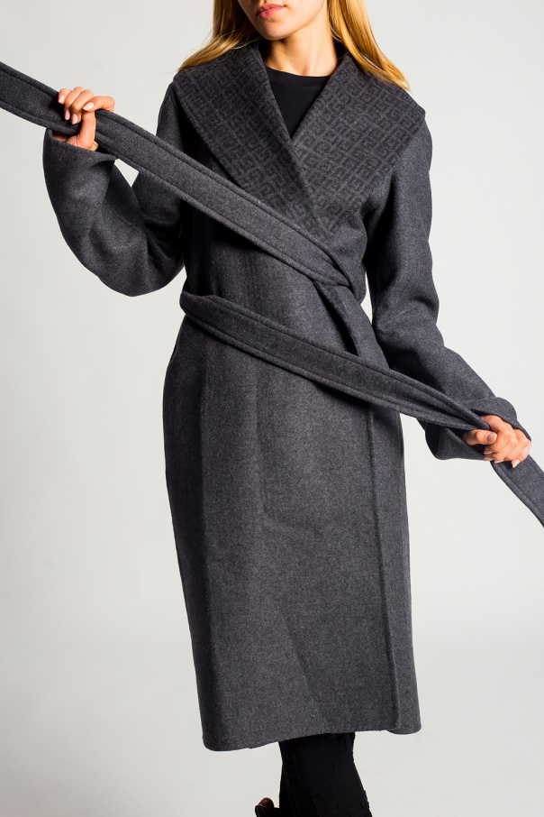 Grey coat from Givenchy. Crafted from a wool, cashmere and silk blend, this style showcases a waist-cinching belt, two slip pockets and the signature ‘G’ monogram pattern.