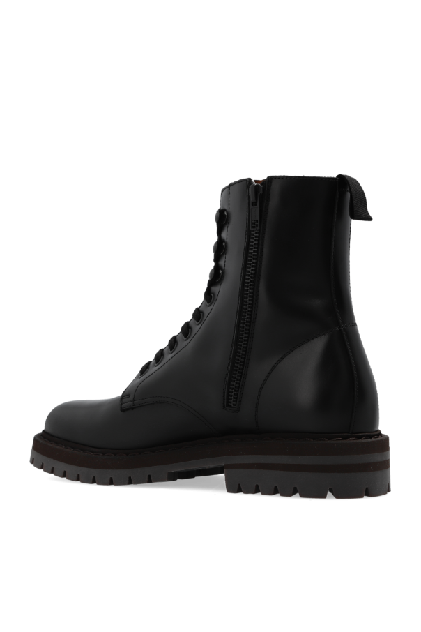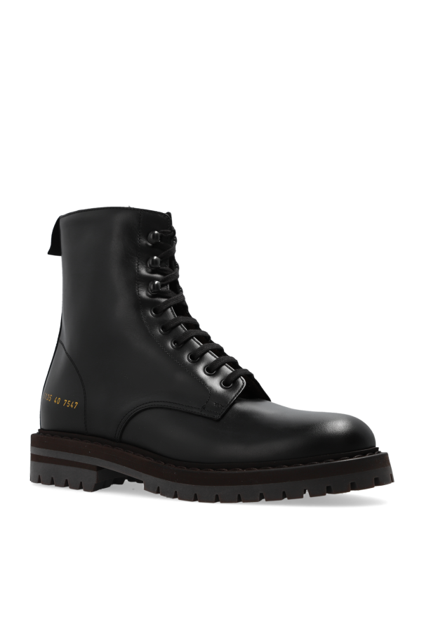 Black combat boots from Common Projects. Crafted from smooth leather, this lace-up pair features a side zip, gold-tone series print and a rubber sole in brown and grey.