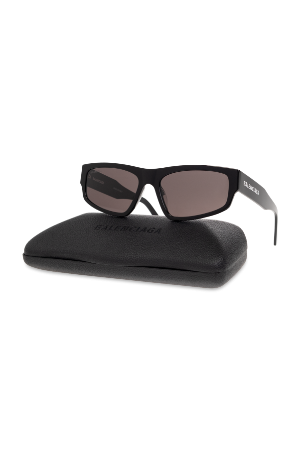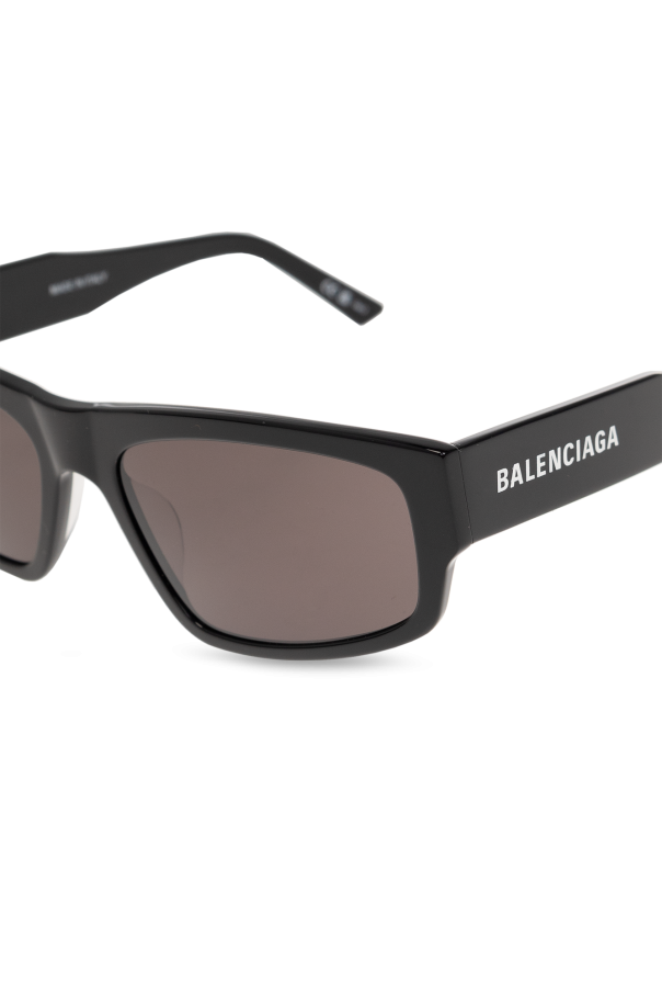 Black ‘Flat’ sunglasses from Balenciaga. This pair features a D-frame, white logo on the side and grey lenses with 100% UV protection. Case included.