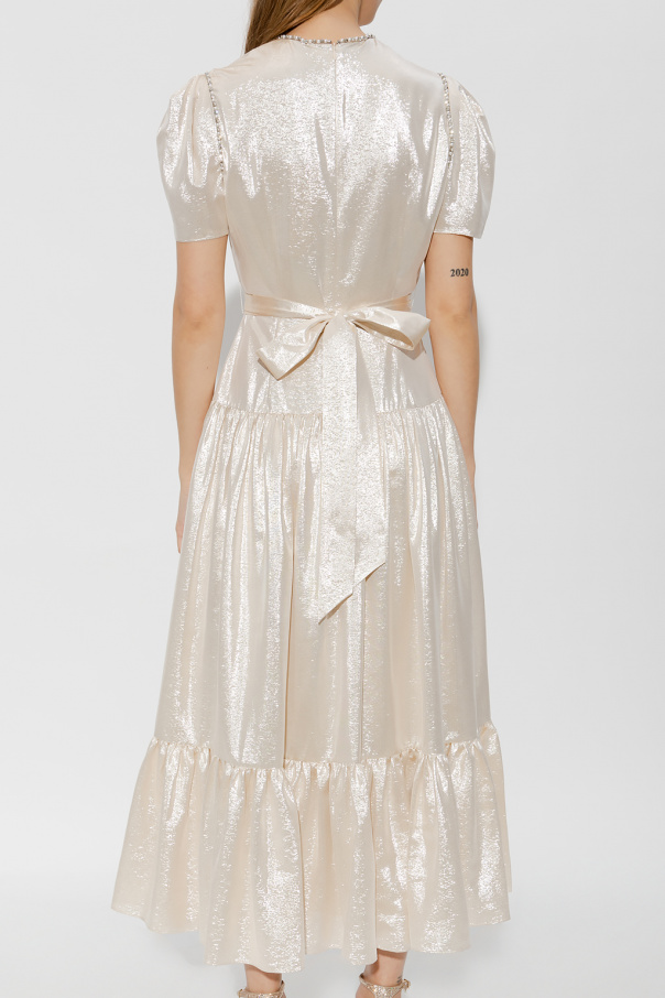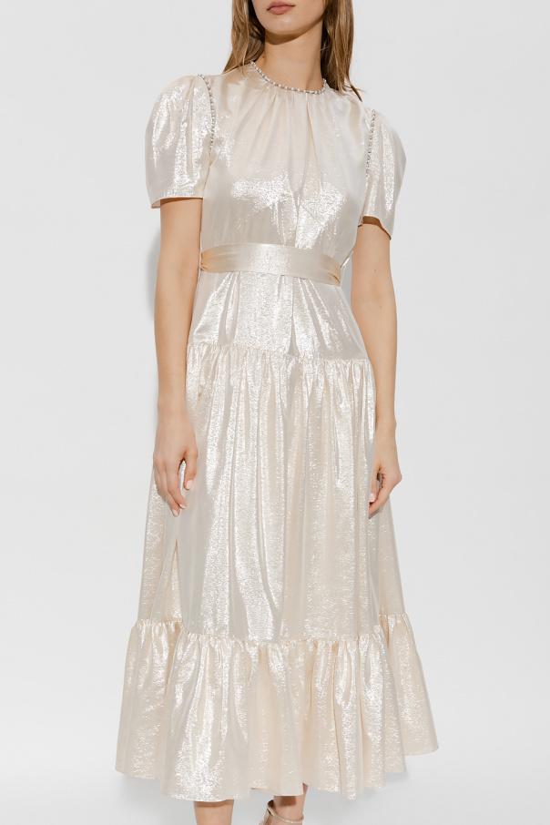 Light gold-tone ‘Laurina’ dress from Erdem. Crafted from silk inlaid with lurex yarn, this style features a round neck, a hidden back zipper, glossy crystal and glass pearl embellishments, short puff sleeves and a flared, below-the-knee hem with a ruffle.