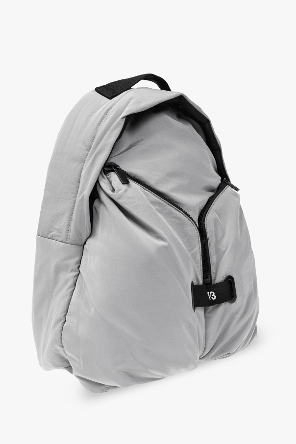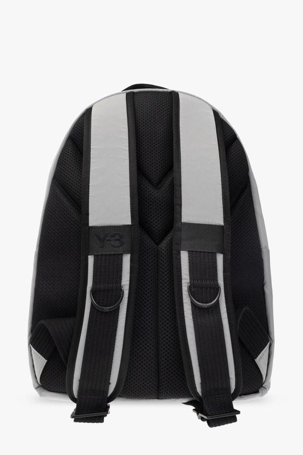 Grey backpack from Y-3 Yohji Yamamoto. Crafted from recycled material, this design secures with a two-way zipper and showcases a decorative grosgrain stripe with an embroidered white logo, two zip front pockets (with slip pockets inside), black metal hardware and one internal compartment with one slip pocket and one zip pocket.