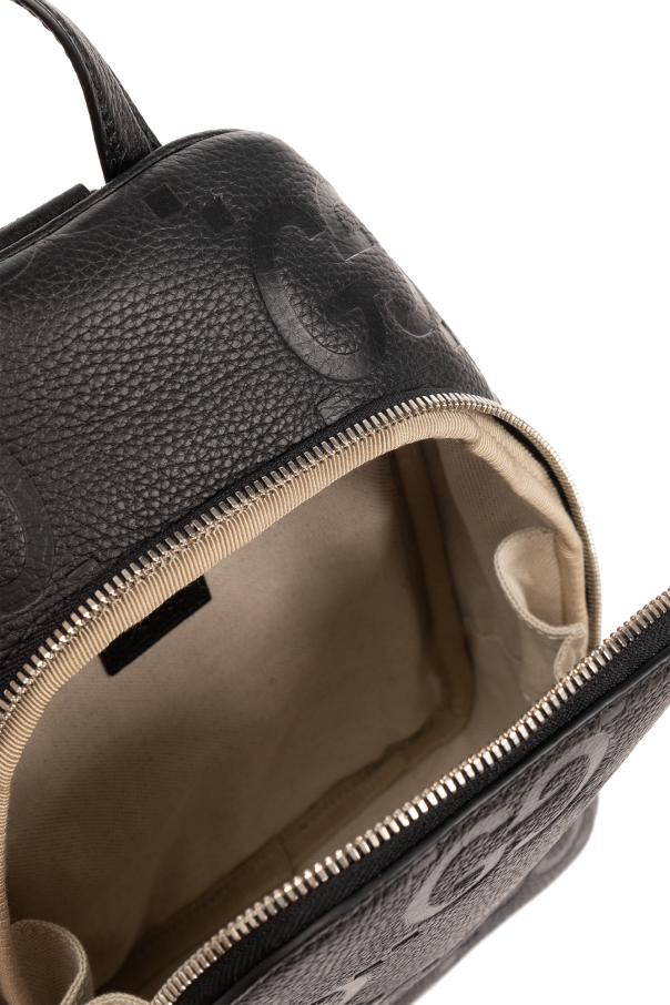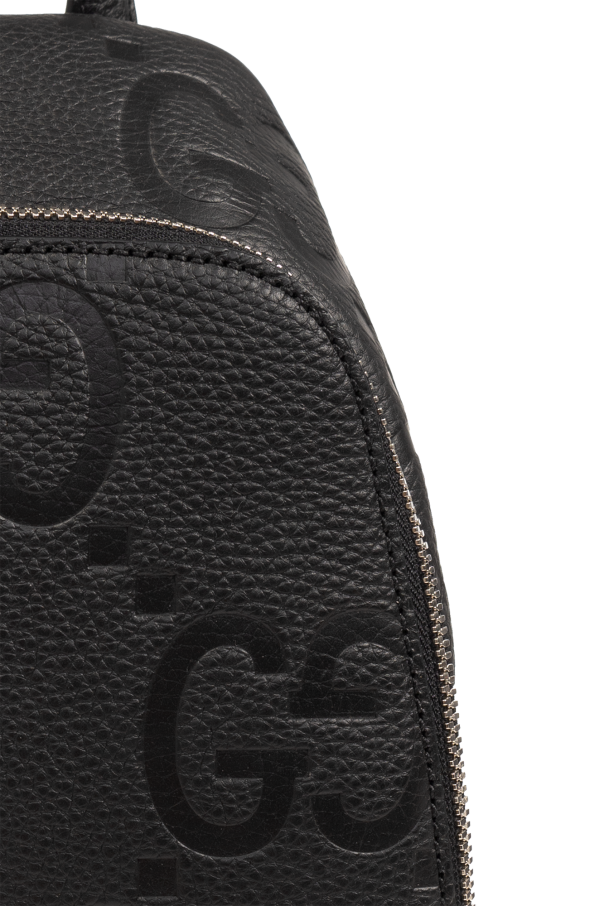 Black ‘Jumbo GG’ one-shoulder backpack from Gucci. Made of leather embossed with the ‘GG’ pattern, this design secures with a two-way zip and features an adjustable strap, one half-round handle, silver-tone metal hardware and one internal compartment with one slip pocket and three card slots.