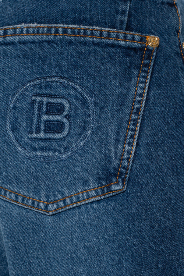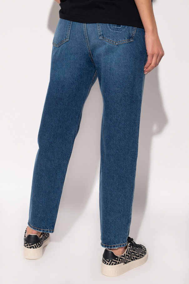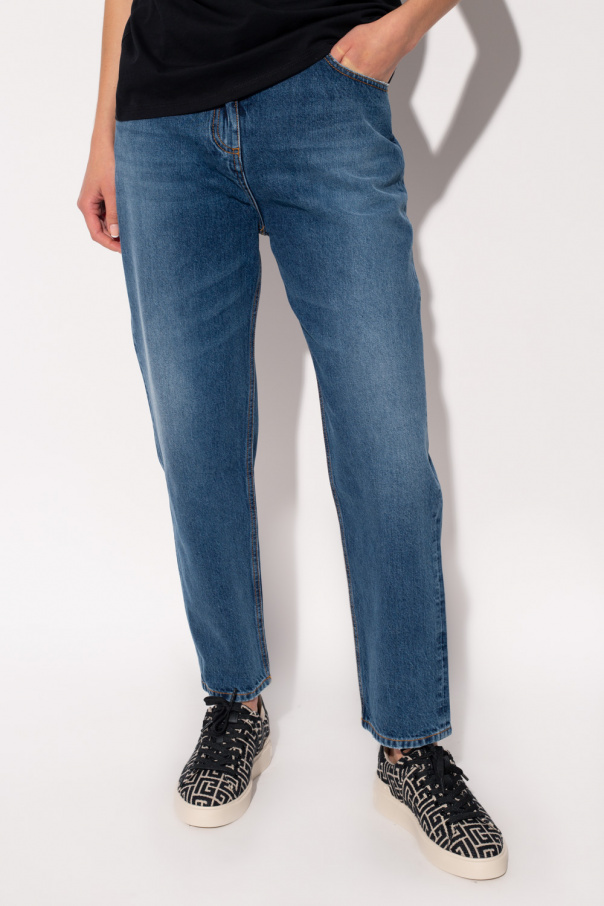 Blue jeans from Balmain. Cut with a high-waisted silhouette, this pair falls with slightly tapered legs and features a zip fly with a button, four pockets on the front and two pockets on the back – one is accentuated with a raised logo.