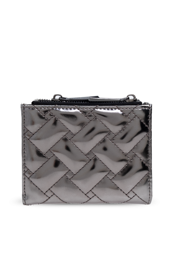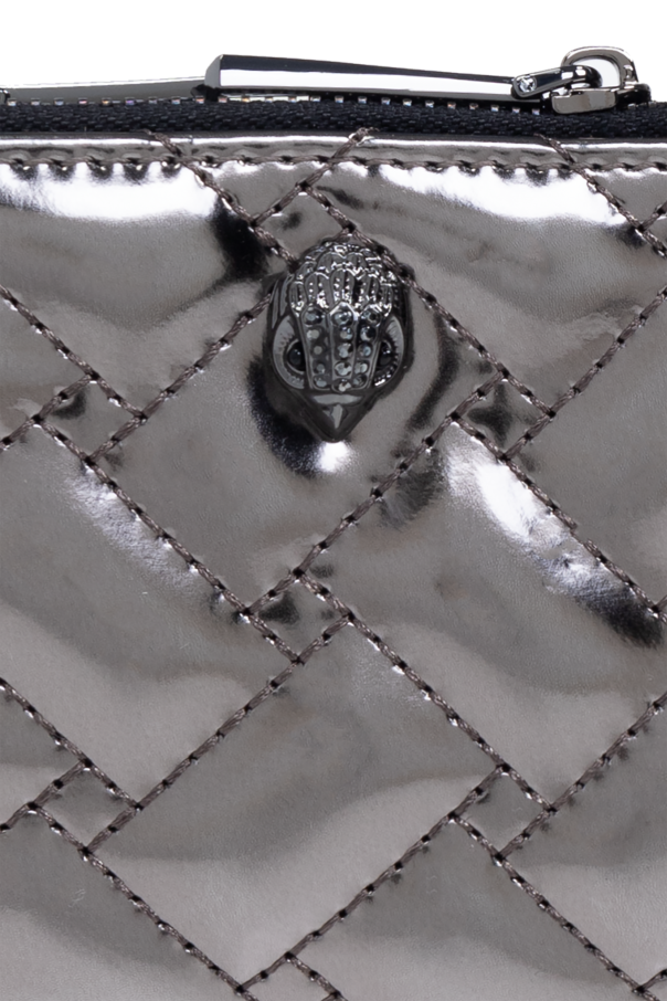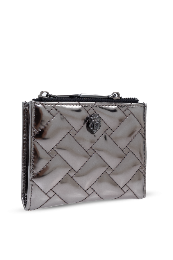 Introducing the Kensington Wallet by Kurt Geiger, a paragon of elegance and functionality. Crafted from lustrous, patent leather, this accessory shines in a sophisticated silver hue, complemented by a mirrored effect that captures the essence of luxury. The wallet\'s exterior boasts a unique pattern of skewed lines reminiscent of a woven texture, enhancing its exclusivity and allure. The Kensington showcases meticulous craftsmanship, evident in the precise stitching and the designer\'s emblem—an ornate insignia that adorns the front, lending a touch of aristocracy. Despite its classic rectangular silhouette, this non-zip wallet surprises with a pragmatic interior. It features a coin pocket with a transparent window, a designated space for banknotes, and six slots for credit cards, all secured with a snap closure. Additionally, two zippered compartments for coins ensure valuables are kept safe and organized. The wallet\'s practical design is matched by its aesthetic appeal. The shimmering material and the designer\'s logo are central to its charm, making the Kensington not just a wallet, but a statement accessory. Why Purchase the Kensington Wallet? Elegance and Sophistication: The silver color and mirror-like effect offer a luxurious appeal. Exceptional Craftsmanship: Precision stitching and an ornate designer logo signify quality. Functional Design: Equipped with a snap closure, multiple card slots, and coin compartments for optimal organization. Exclusive Material: Made from 100% patent leather, ensuring durability and a glossy finish.